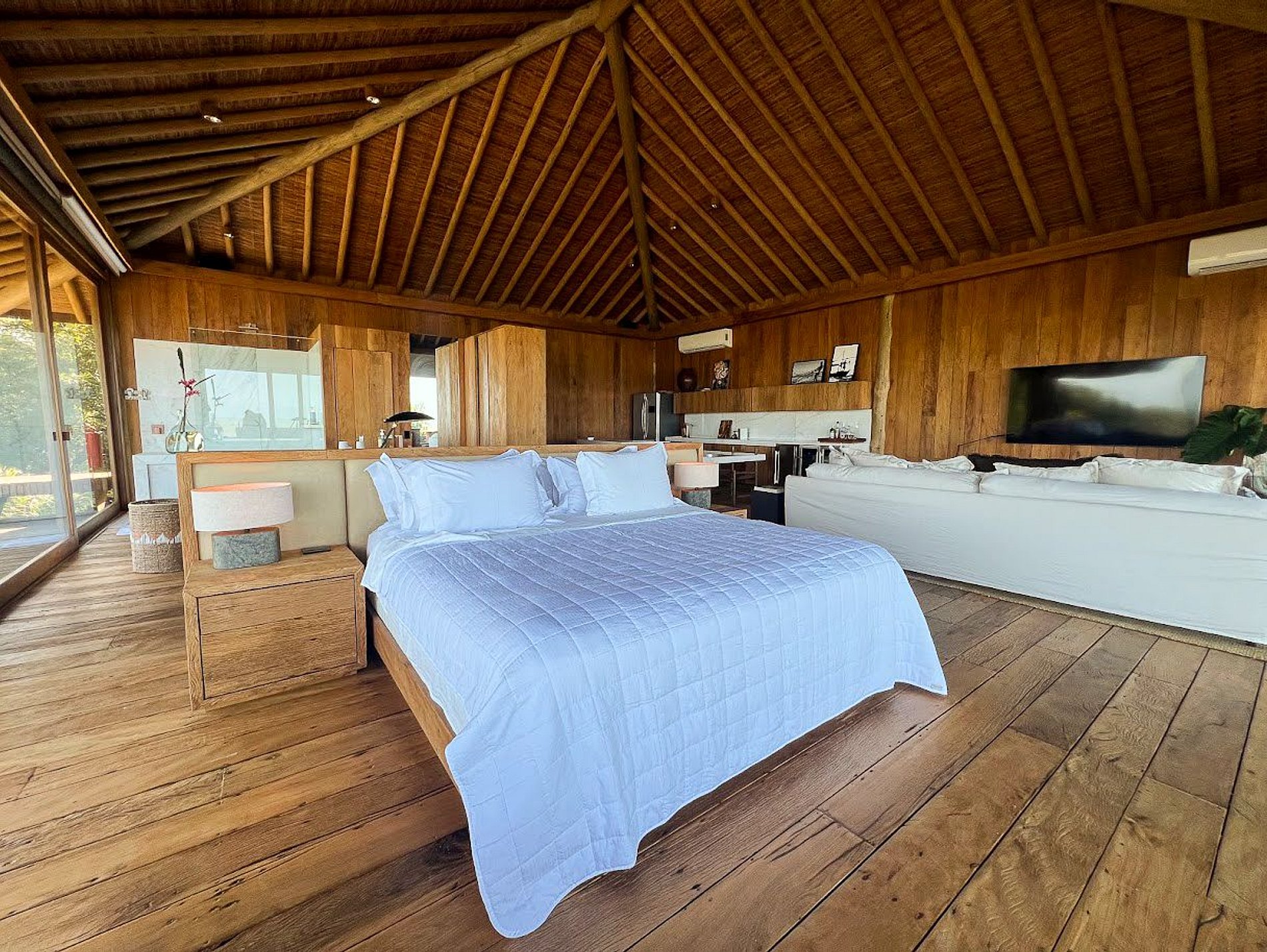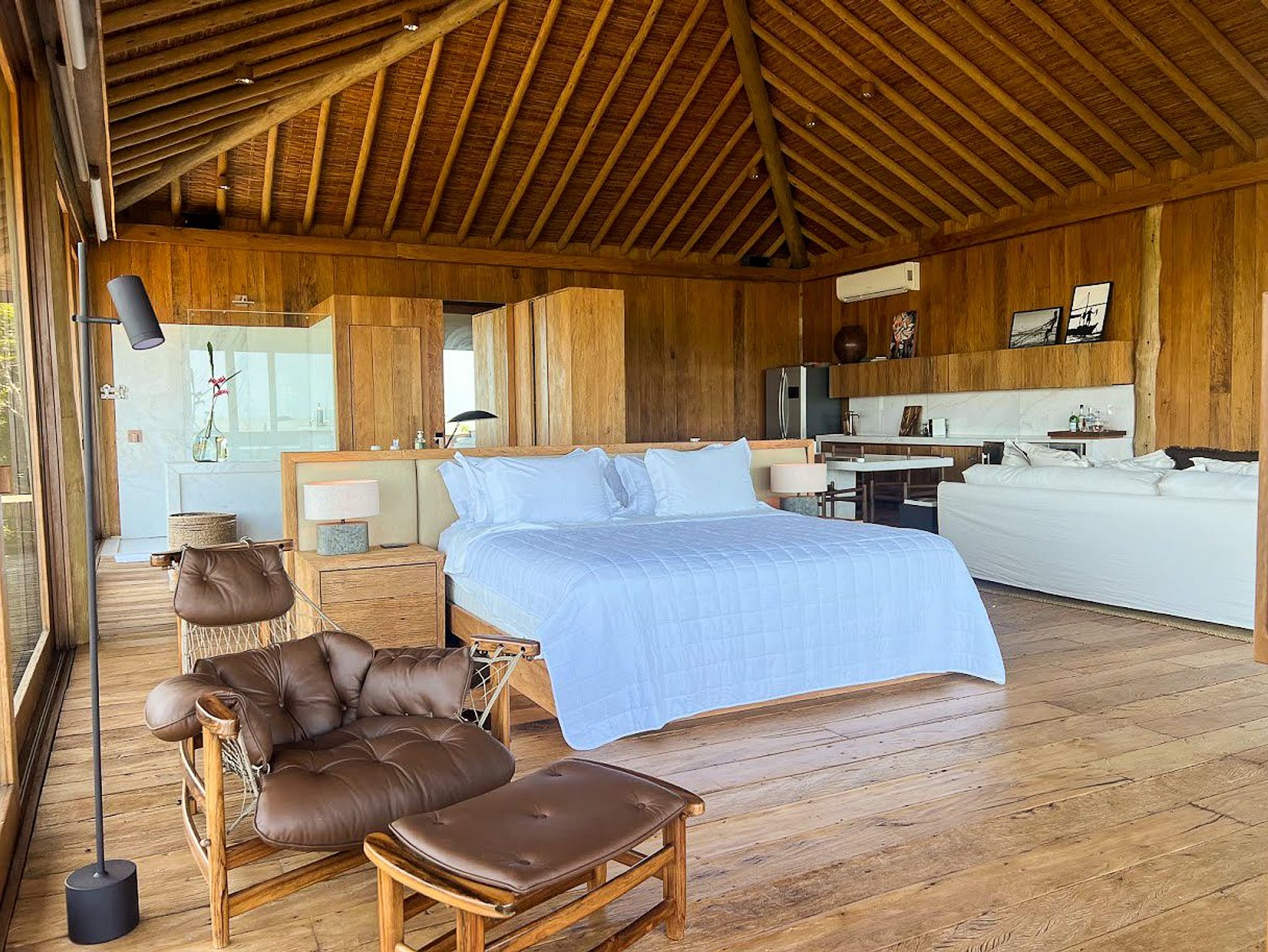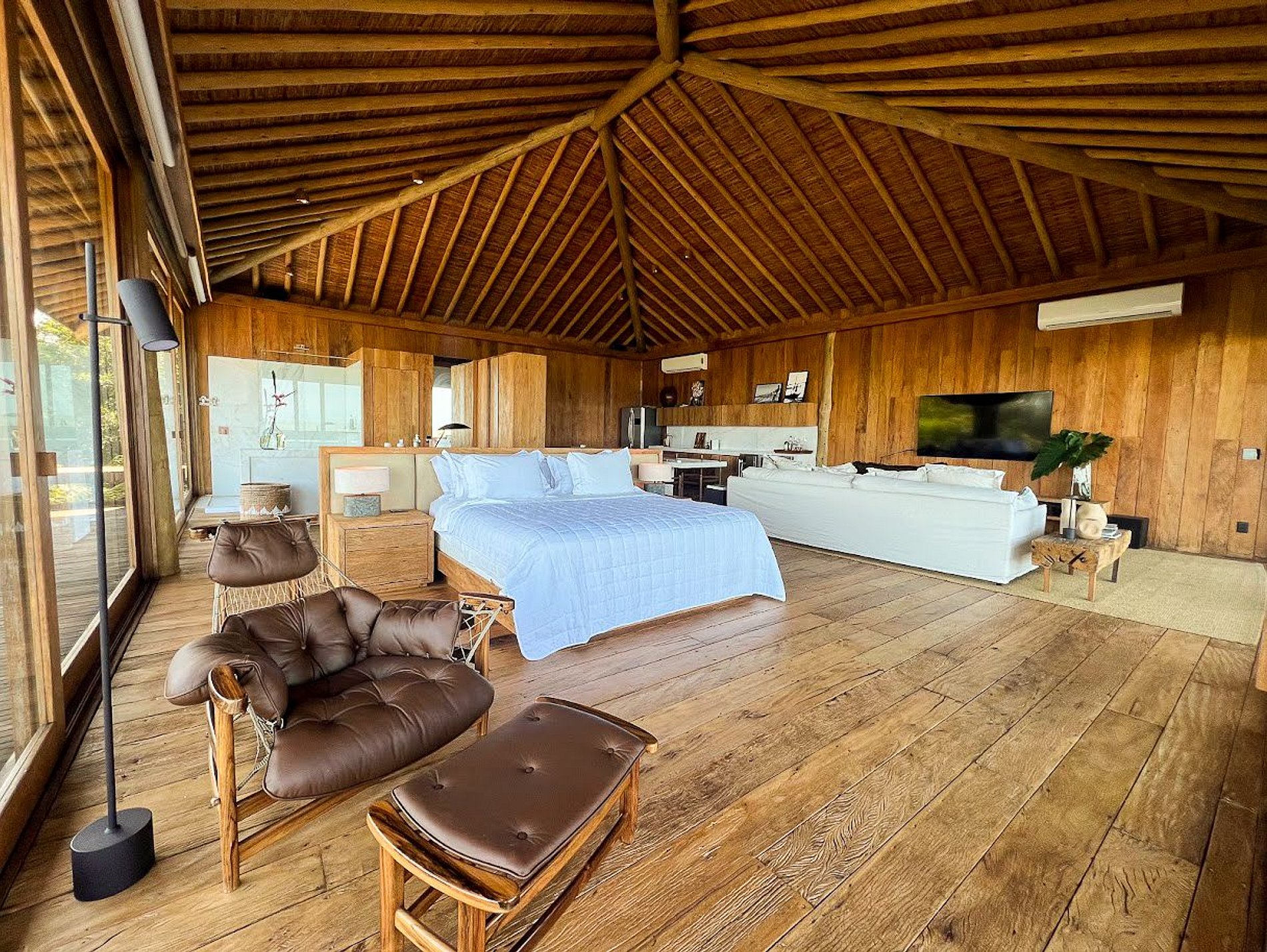 Bangalô Master exclusivo, completo como um apartamento em um único ambiente integrado. Dispõe de cama king, cozinha equipada, banheira jacuzzi com vista deslumbrante para o mar e design sofisticado. Localizado em região privilegiada, une privacidade, conforto e praticidade em um só espaço, ideal para casais ou hóspedes que valorizam luxo e contato direto com a natureza.