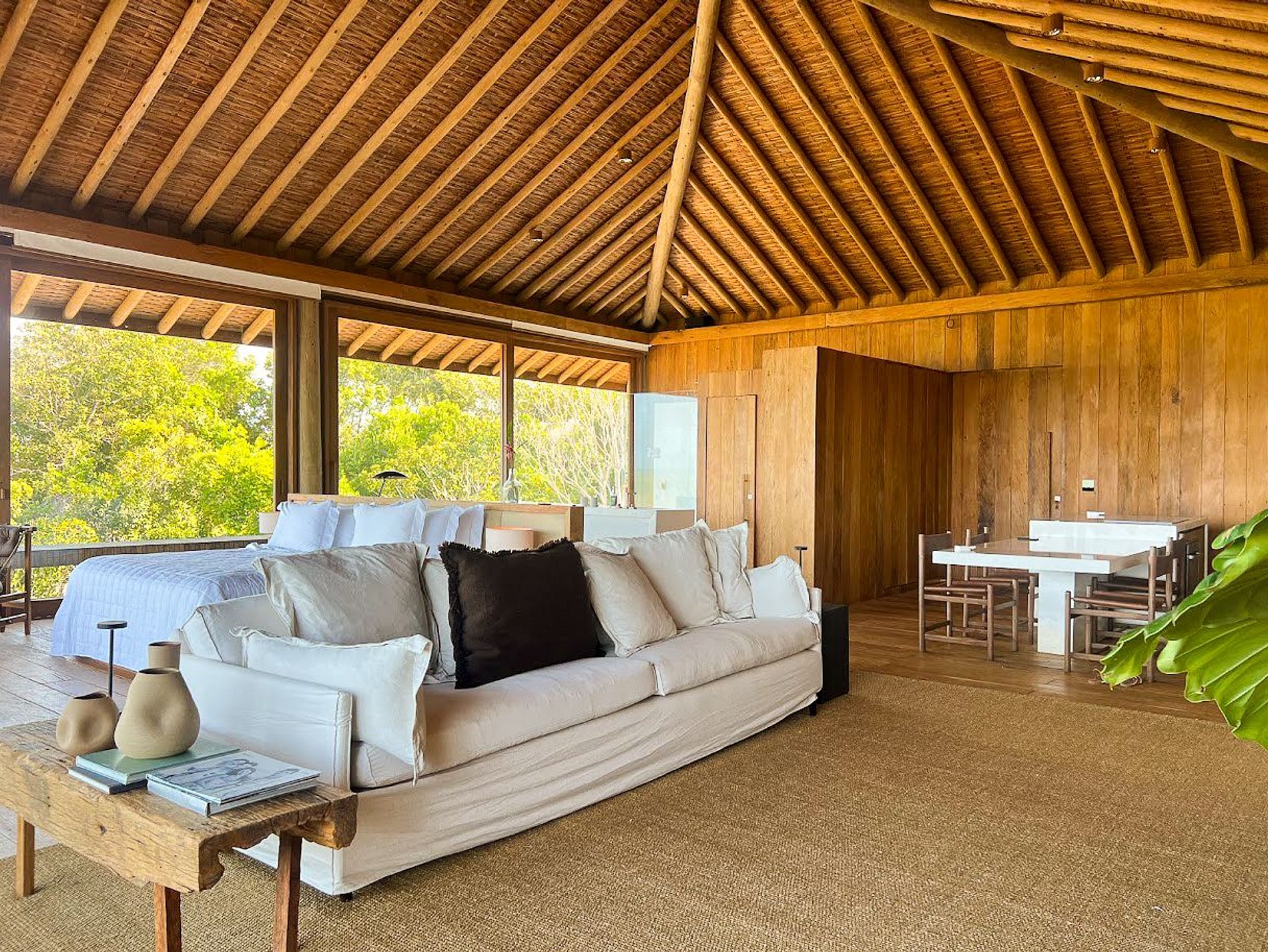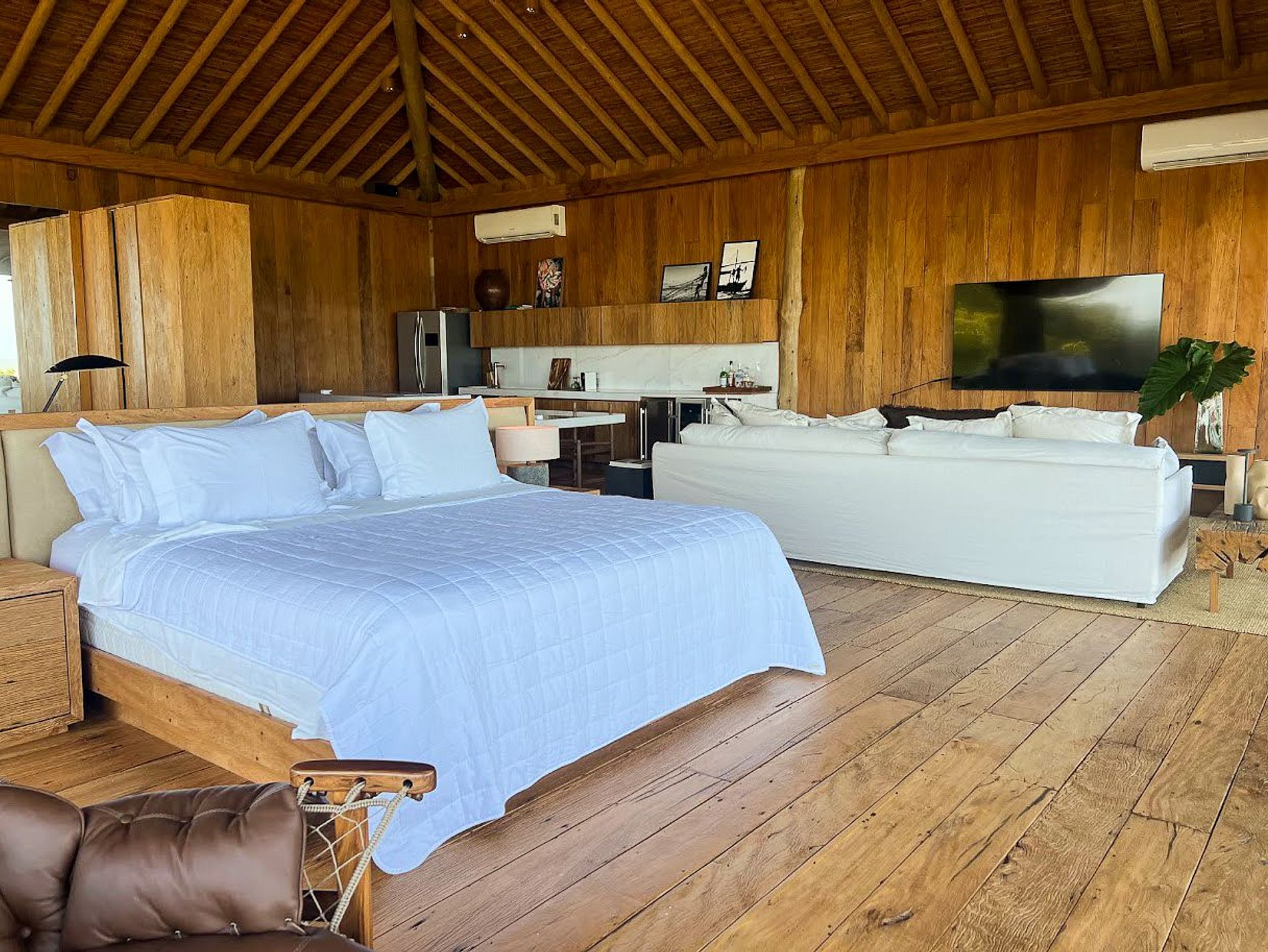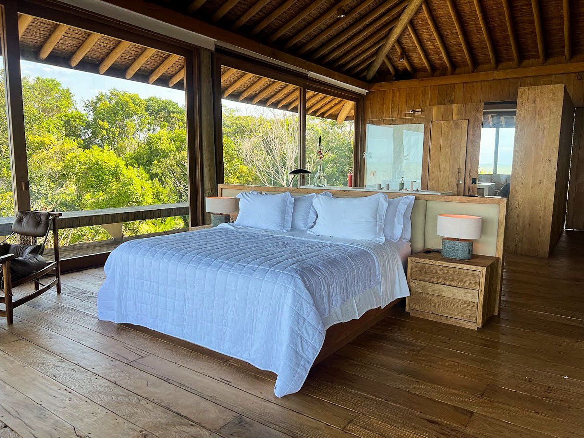 Bangalô Master exclusivo, completo como um apartamento em um único ambiente integrado. Dispõe de cama king, cozinha equipada, banheira jacuzzi com vista deslumbrante para o mar e design sofisticado. Localizado em região privilegiada, une privacidade, conforto e praticidade em um só espaço, ideal para casais ou hóspedes que valorizam luxo e contato direto com a natureza.