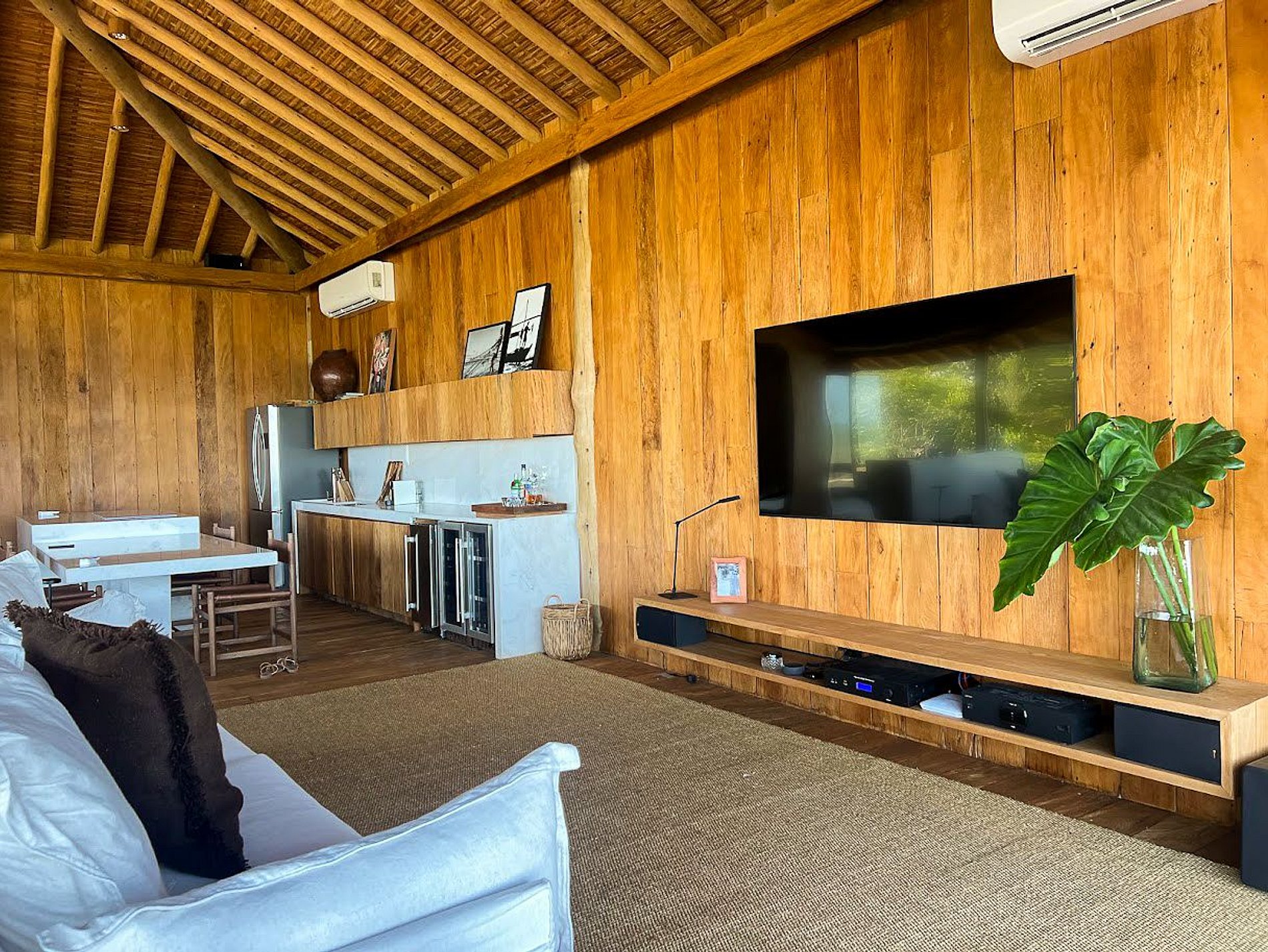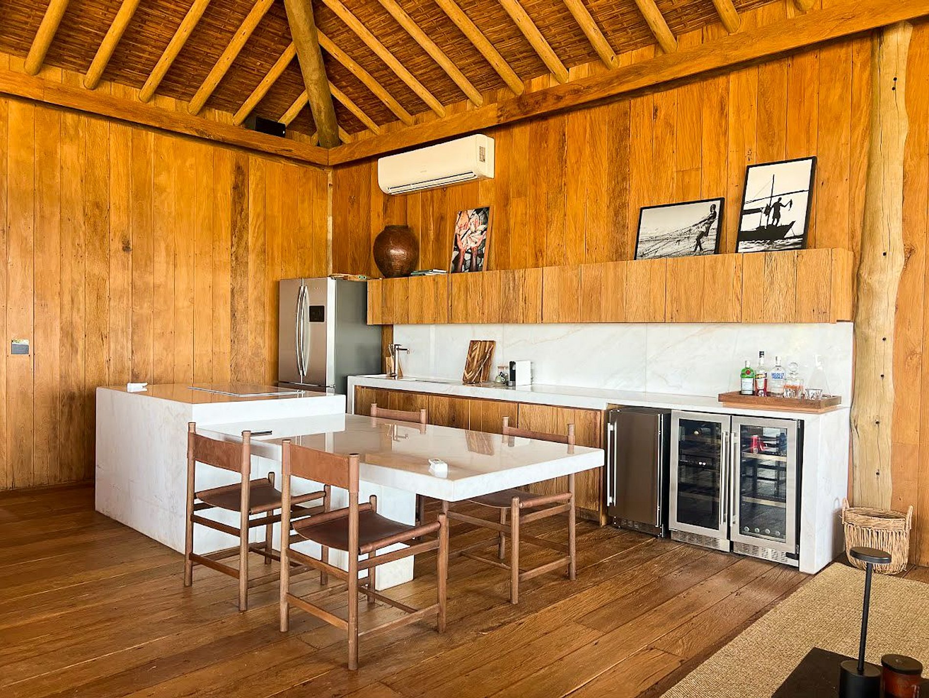 O bangalô oferece ar-condicionado, Wi-Fi de alta velocidade, enxoval premium e amenities de banho. A cozinha é equipada com utensílios básicos, frigobar e cafeteira. A jacuzzi, posicionada estrategicamente diante da vista para o mar, é um convite ao relaxamento. O ambiente foi planejado para garantir bem-estar e praticidade em cada detalhe.