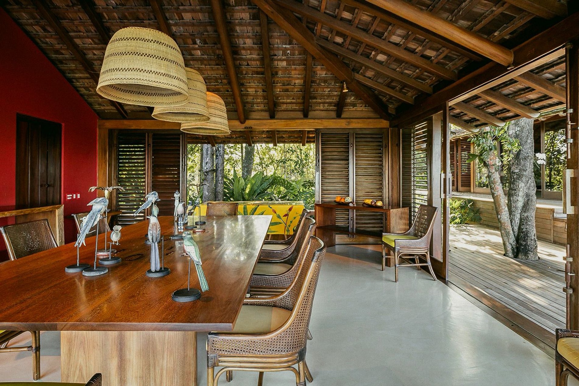 A área social reúne uma sala de estar envolvida por deck de madeira, pergolado e vista para o gramado que se conecta à piscina, ao espaço gourmet e à cozinha totalmente equipada. A decoração, marcada pelo bom gosto, apresenta uma coleção belíssima de arte popular brasileira, com peças únicas garimpadas no semiárido nordestino.